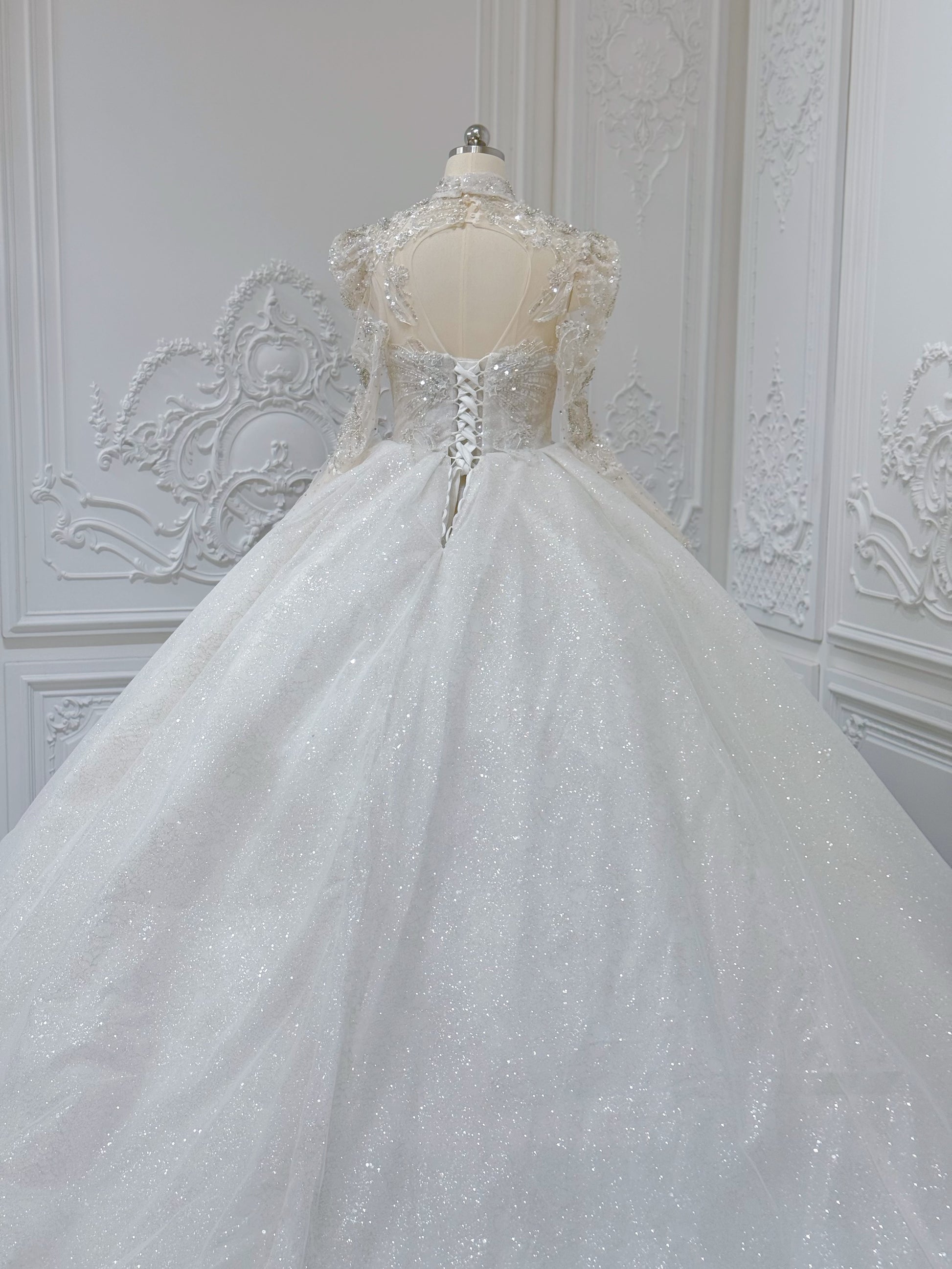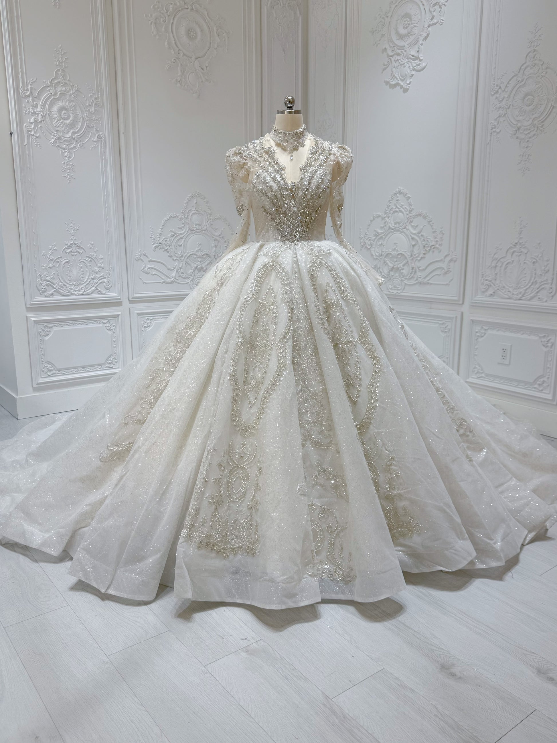 Stock Clearance! Bridal size 10! Luxury crystal beaded with beading lace long sleeve Victorian royal wedding dress with detachable neckpiece
