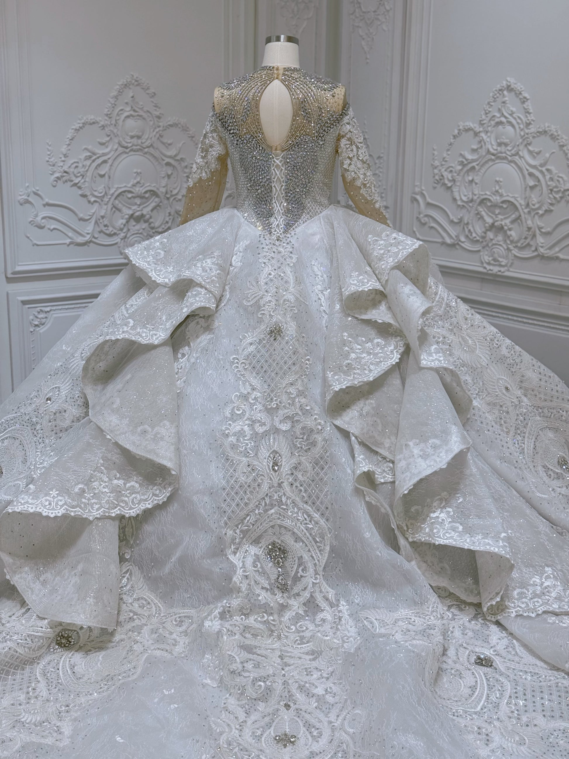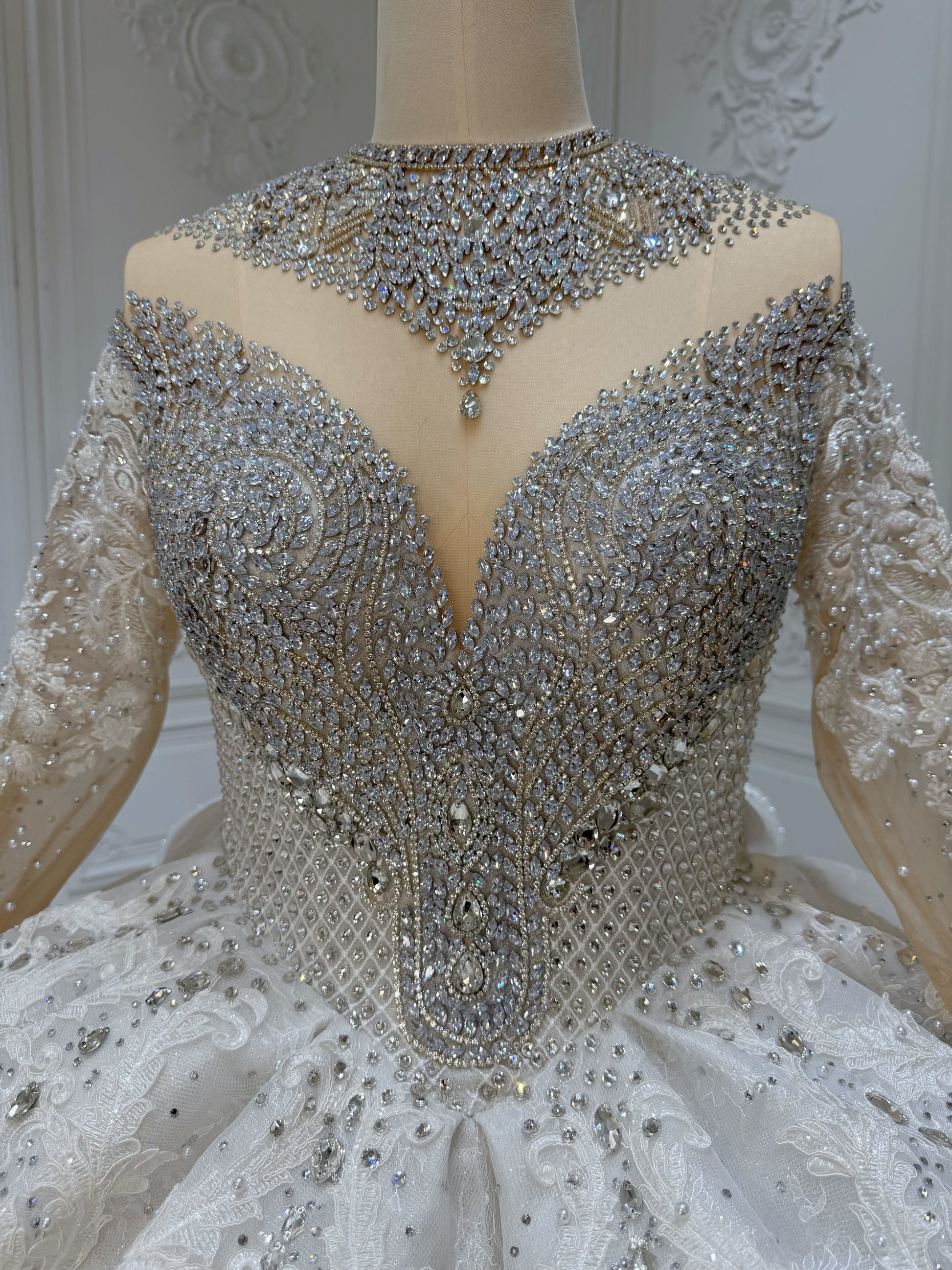 Stock Clearance! Bridal Size 12! Luxury crystal beaded with lace embroidered sparkling long sleeve high neck royal wedding dress