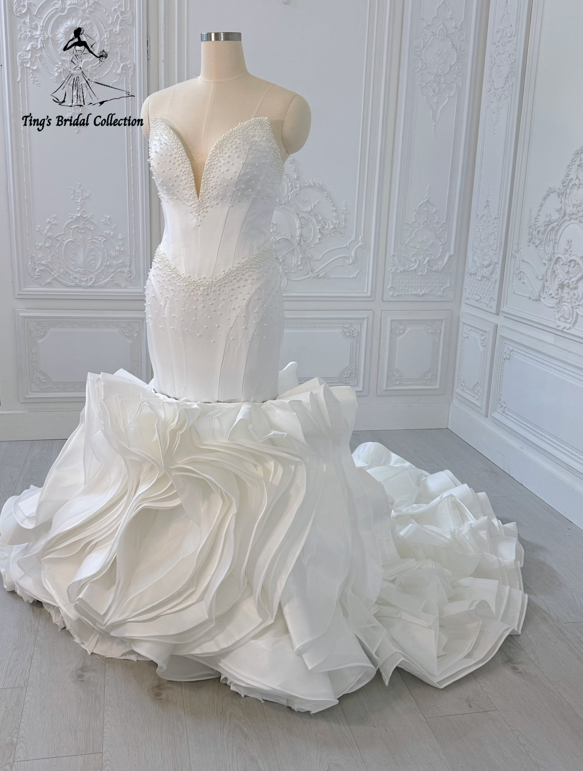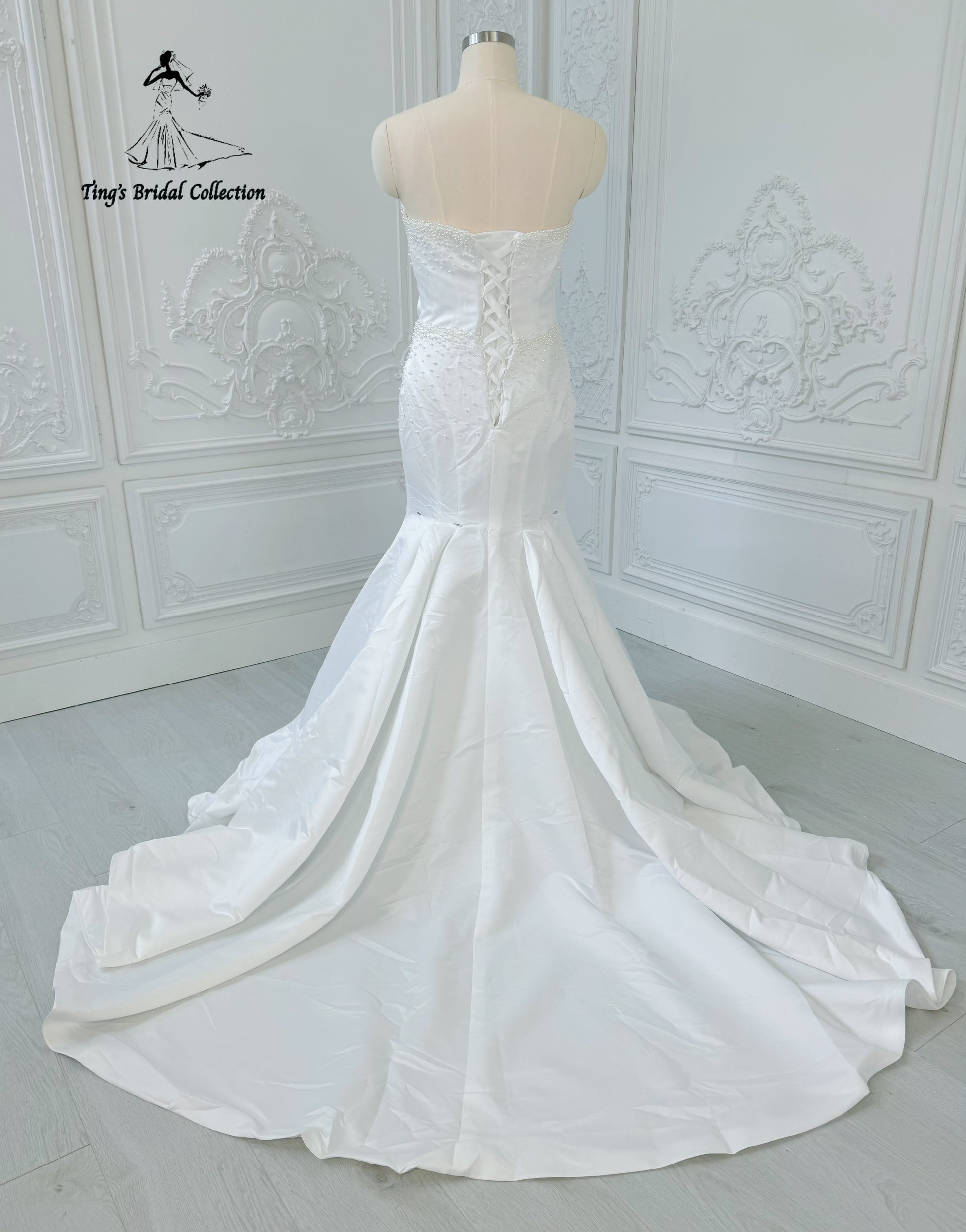 Stock clearance! Bridal size 14! White satin pearl beaded mermaid wedding dress with detachable ruffled skirt
