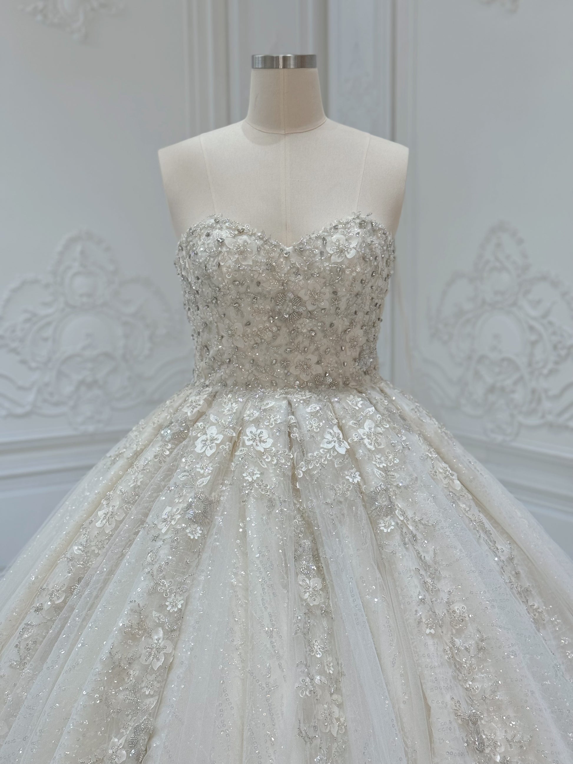Stock Clearance! Bridal size 12! Champagne strapless/off the shoulder puffy long sleeve beaded 3D floral full ballgown fairy wedding dress