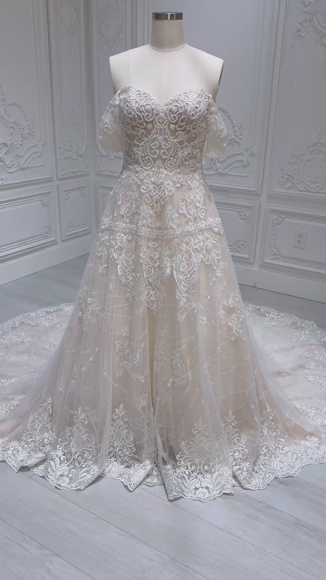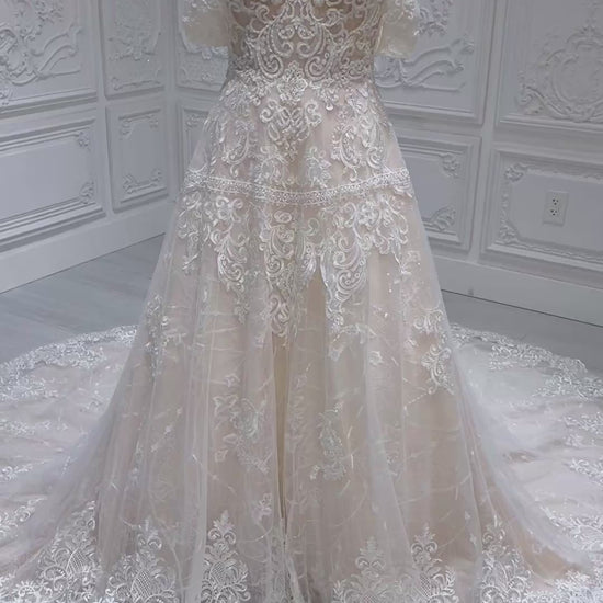 Stock Clearance! Bridal size 12-14! Cream color lace embroidered off the shoulder Aline wedding dress