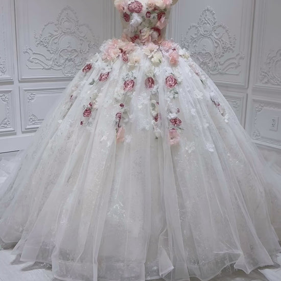Stock clearance! Sparkling colorful 3D floral with lace embroidered strapless fairy ballgown wedding dress/Quinceanera dress/ Sweet 16 dress