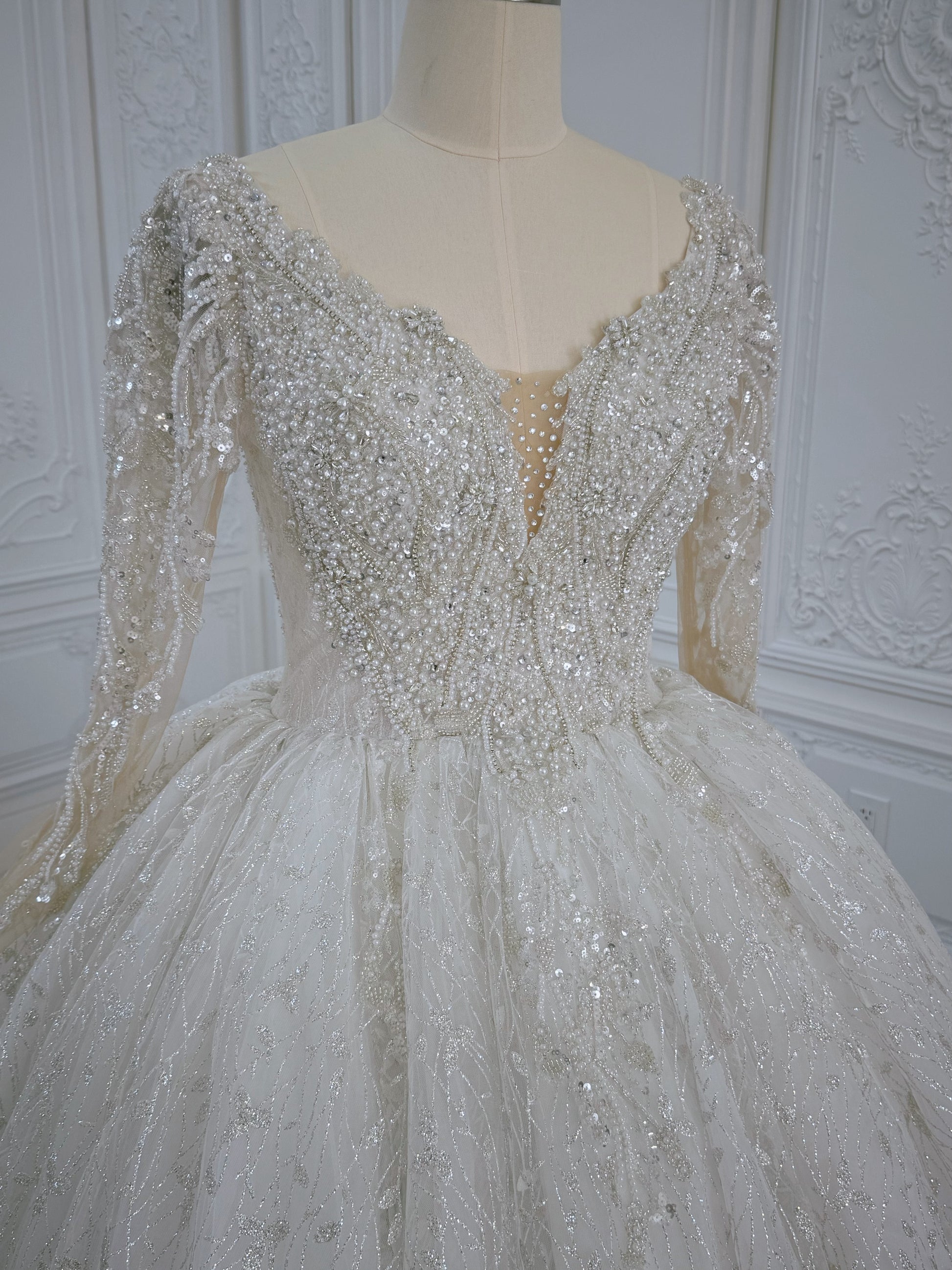 TBC-B005 Off white luxury beading long sleeve with plunge sparkling princess ballgown wedding dress