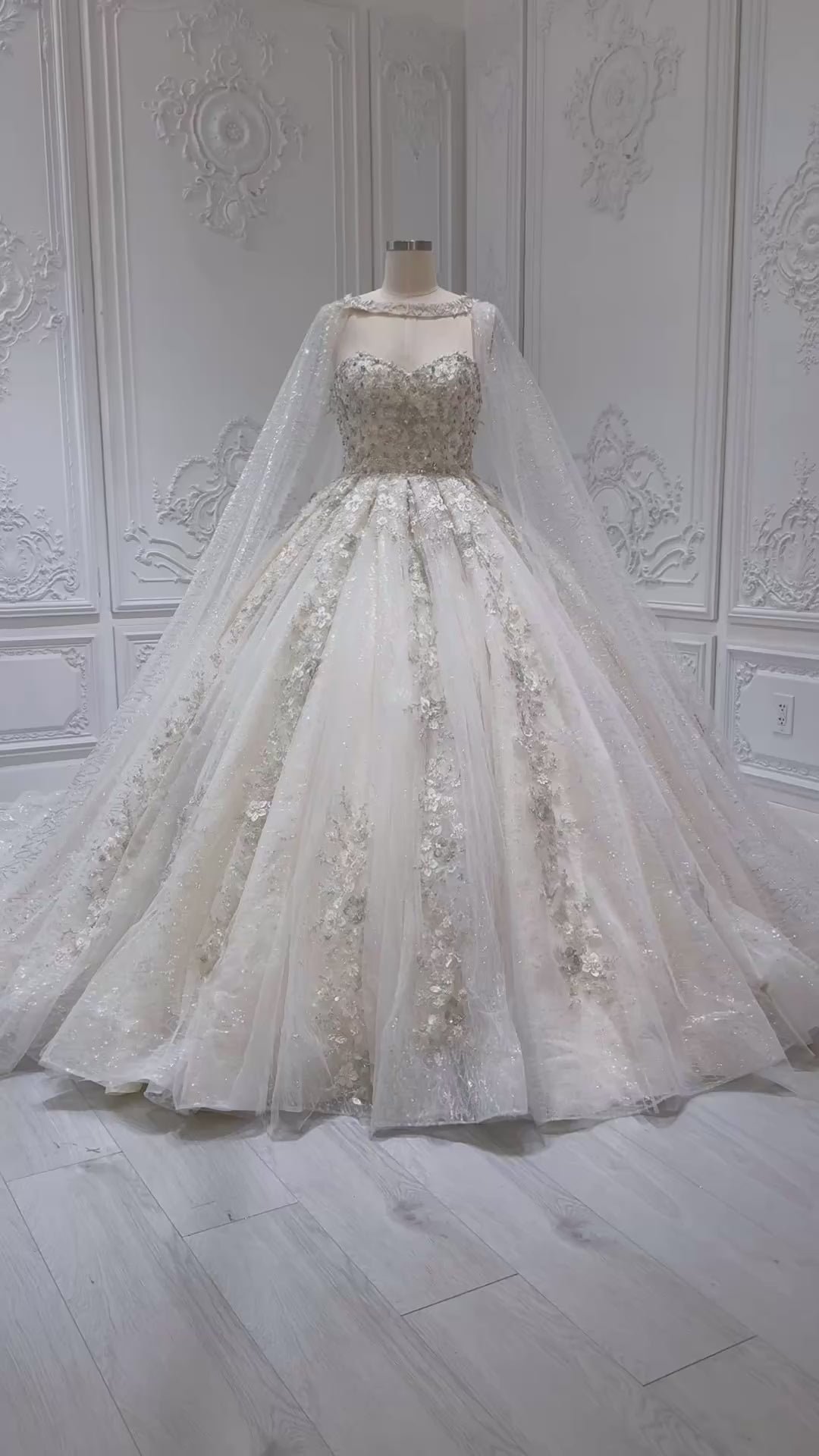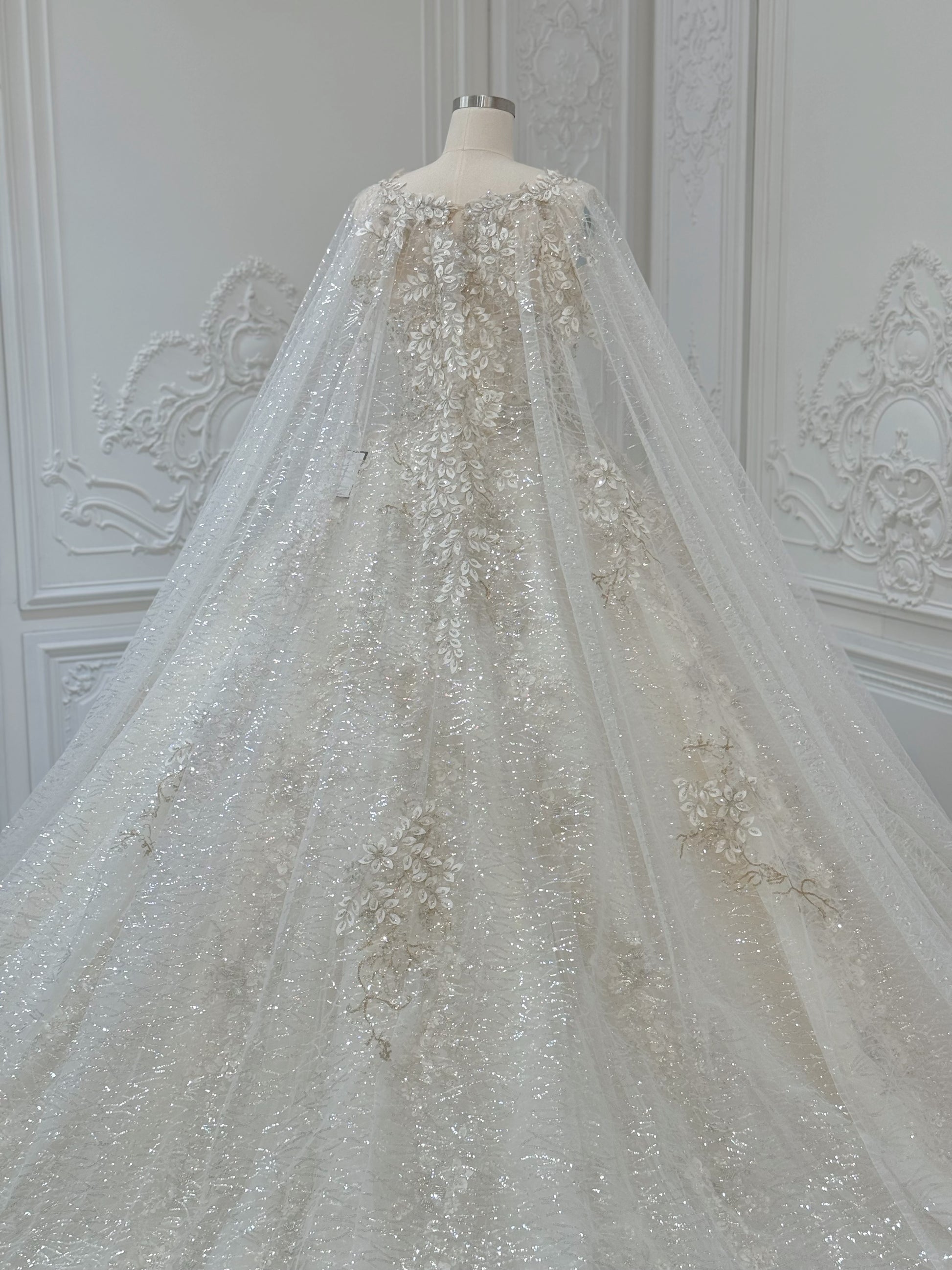 Stock Clearance! Bridal Size 12! Champagne color sparkling 3D floral lace princess ballgown fairy wedding dress with detachable cape