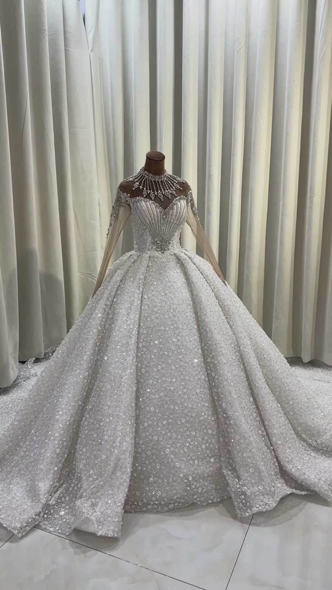 TBC-CM007 Made to order luxury crystal beading sparkling high neck with long sleeve princess ballgown wedding dress